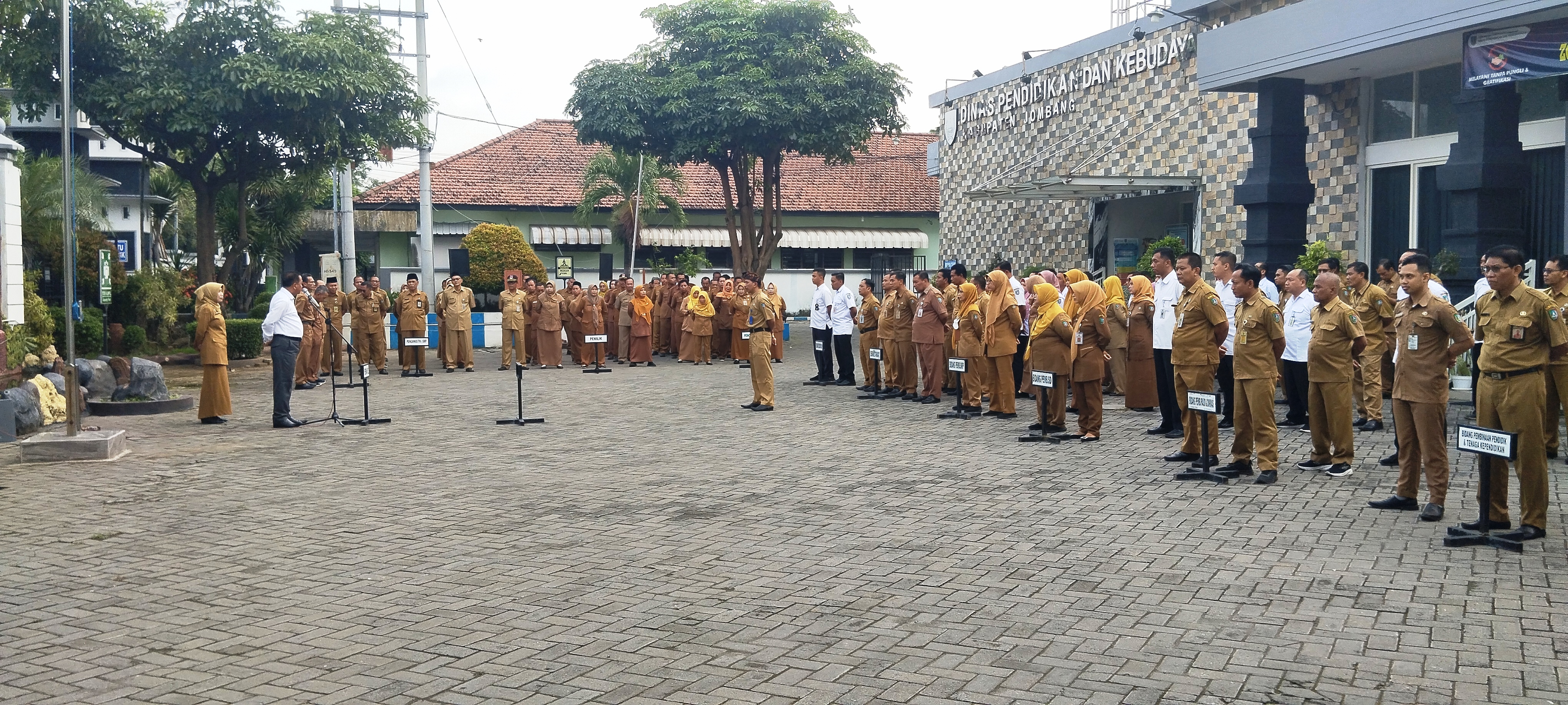 DISDIKBUD – Apel kerja di Dinas Pendidikan dan Kebudayaan (Disdikbud) Kabupaten Jombang pada Senin (3/2) pagi, merupakan apel kerja yang istimewa karena dipimpin langsung Agus Purnomo Sekretaris Daerah Kabupaten Jombang. Ini bentuk tindaklanjut dari Permenpan RB Nomor 21 tahun 2024 tentang Jabatan Fungsional Guru. Dimana para Pengawas Sekolah dan Penilik berubah menjadi Pendamping Satuan Pendidikan.