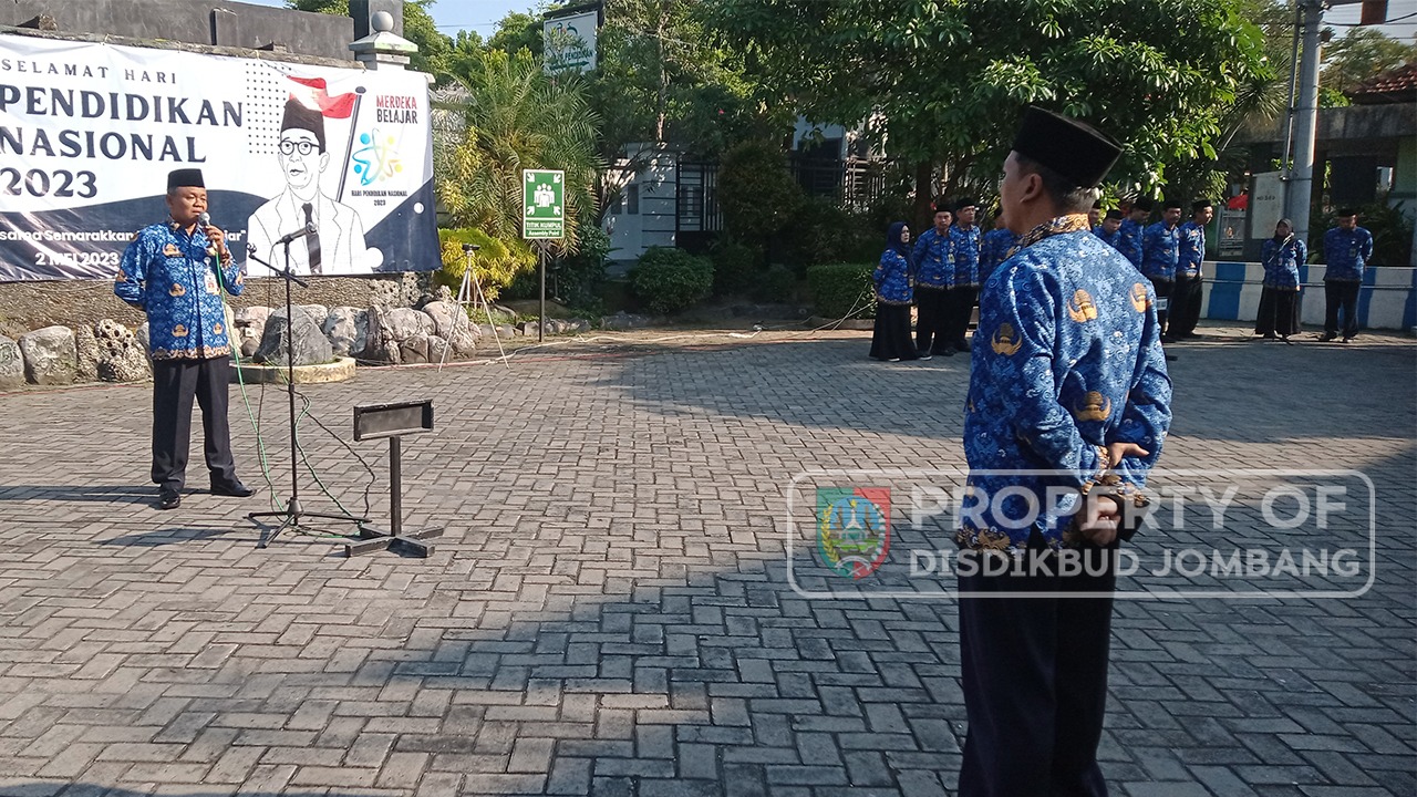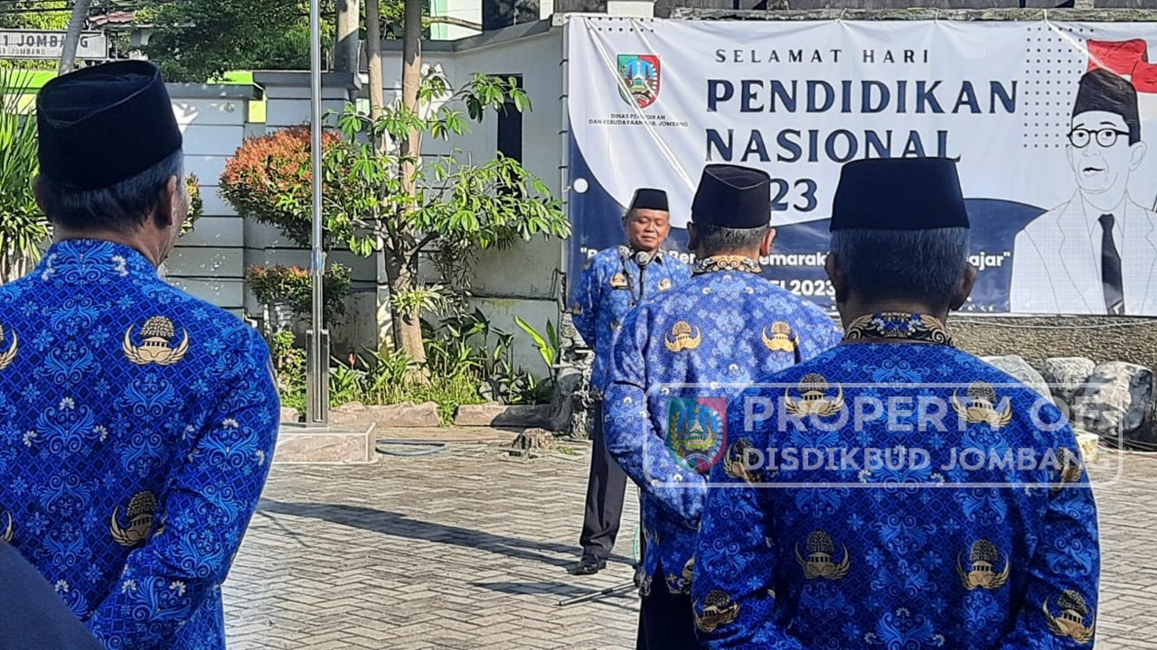 Tampak pada Rabu (17/5) pagi, semua pegawai Dinas Pendidikan dan Kebudayaan (Disdikbud) Kabupaten Jombang mengikuti apel kerja dengan mengenakan seragam KORPRI.