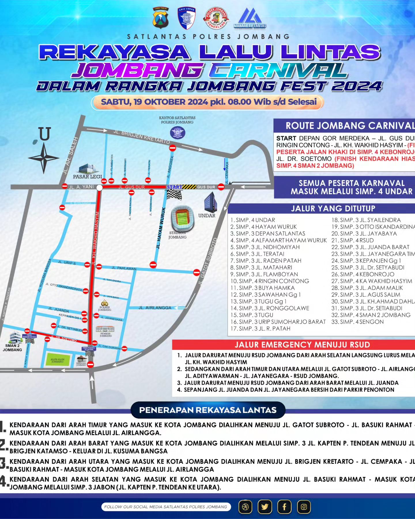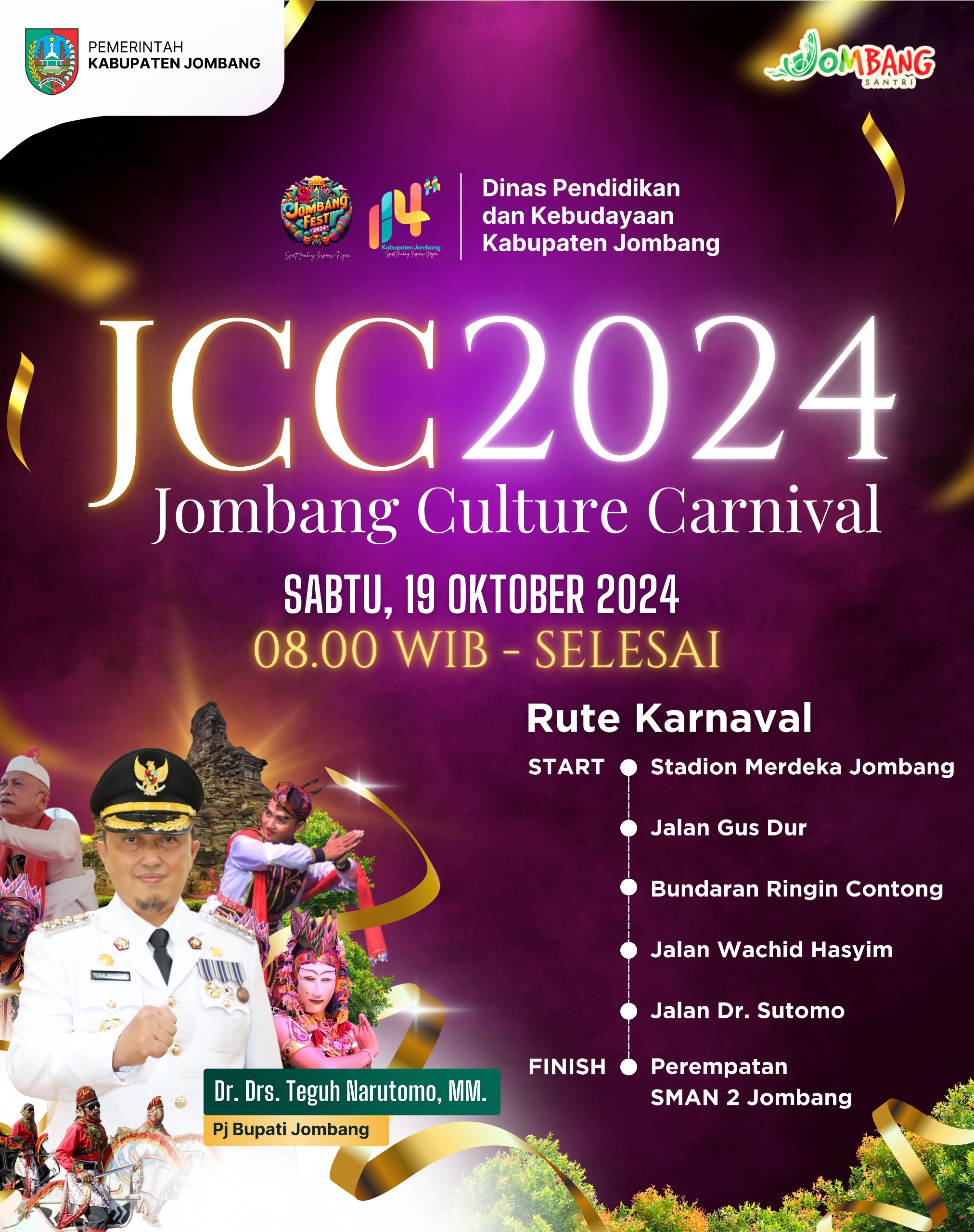DISDIKBUD – Pemerintah Kabupaten Jombang akan menggelar Jombang Culture Carnival (JCC) 2024, yang merupakan rangkaian dalam Jombang Fest dalam rangka Hari Jadi Pemerintah Kabupaten Jombang ke-114 dan Hari Santri Nasional. JCC bakal digelar besok Sabtu, 19 Oktober 2024 pukul 8.00 WIB. Adapun start dimulai dari Gedung Olah Raga (GOR) Merdeka Jombang lalu menuju Jalan Gus Dur - Ringin Contong - Jalan Wachid Hasyim - Perempatan Kebonrejo – Jalan Dr. Soetomo – dan berakhir di Perempatan SMA Negeri 2 Jombang.
