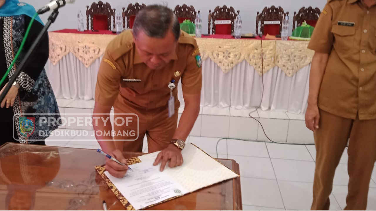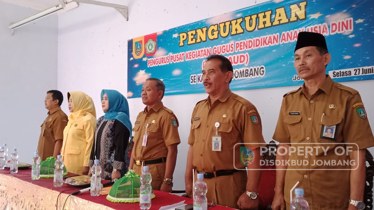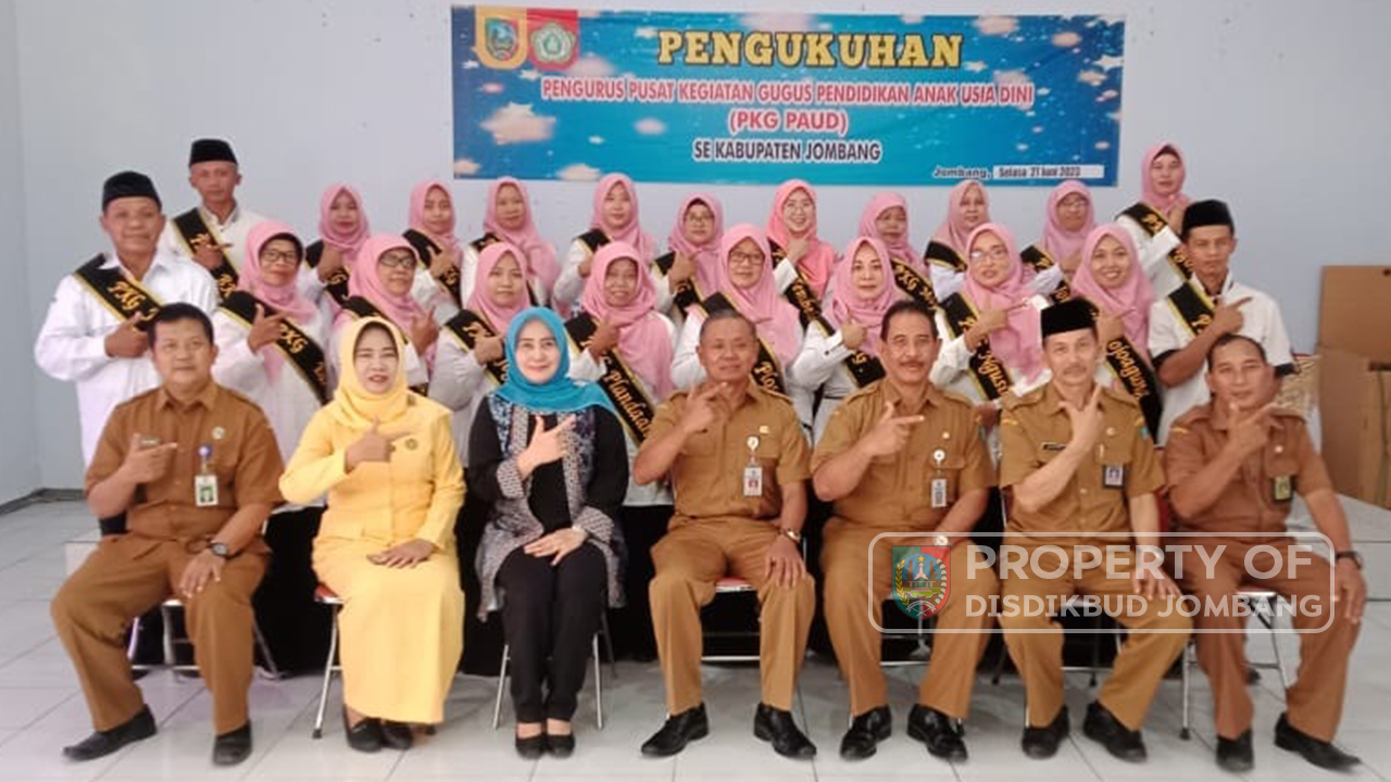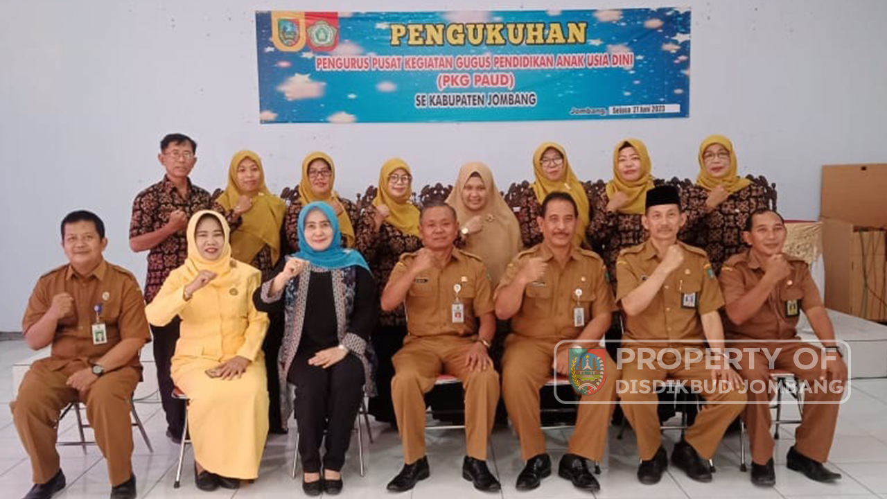 DISDIKBUD – Kepala Dinas Pendidikan dan Kebudayaan (Disdikbud) Kabupaten Jombang, Senen mengukuhkan Pengurus Pusat Kegiatan Gugus (PKG) Pendidikan Anak Usia Dini (PAUD) Se Kabupaten Jombang Periode 2023 - 2026, pada Selasa (27/6) pagi di Aula 2 Disdikbud Jombang.