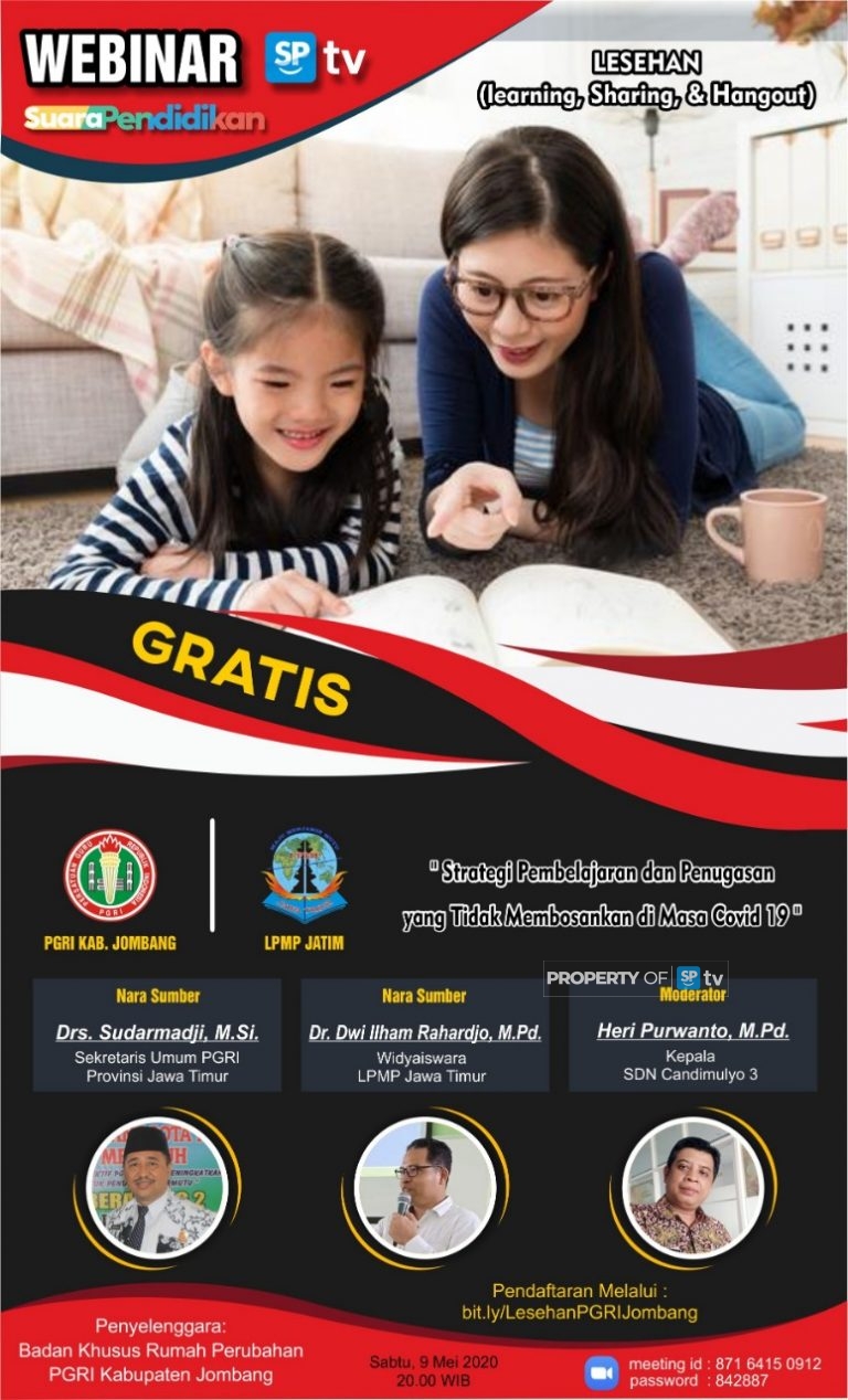 JOMBANGKAB.GO.ID, DISDIKBUD - Di Tengah masa pandemi COVID-19 yang menyebabkan proses belajar di rumah di perpanjang sementara hingga Juni mendatang, tentu membuat kegiatan belajar beralih menjadi penugasan di rumah dan tak jarang menimbulkan masalah. Melihat kondisi ini PGRI, Suarapendidikan TV, dan LPMP menggelar Webinar LESEHAN (Learning, Sharing, & Hangout).