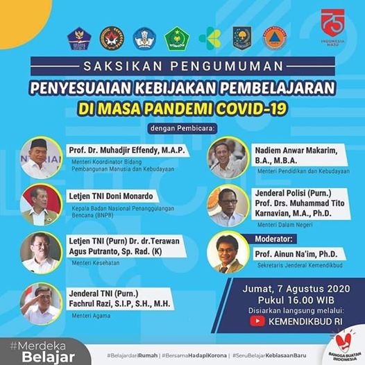 JOMBANGKAB.GO.ID, DISDIKBUD - Yuk Simak Pengumuman Penyesuaian Kebijakan Pembelajaran di Masa Pandemi Covid-19 pada Jumat, 7 Agustus 2020, pukul 16.00 WIB, di Youtube KEMENDIKBUD RI.