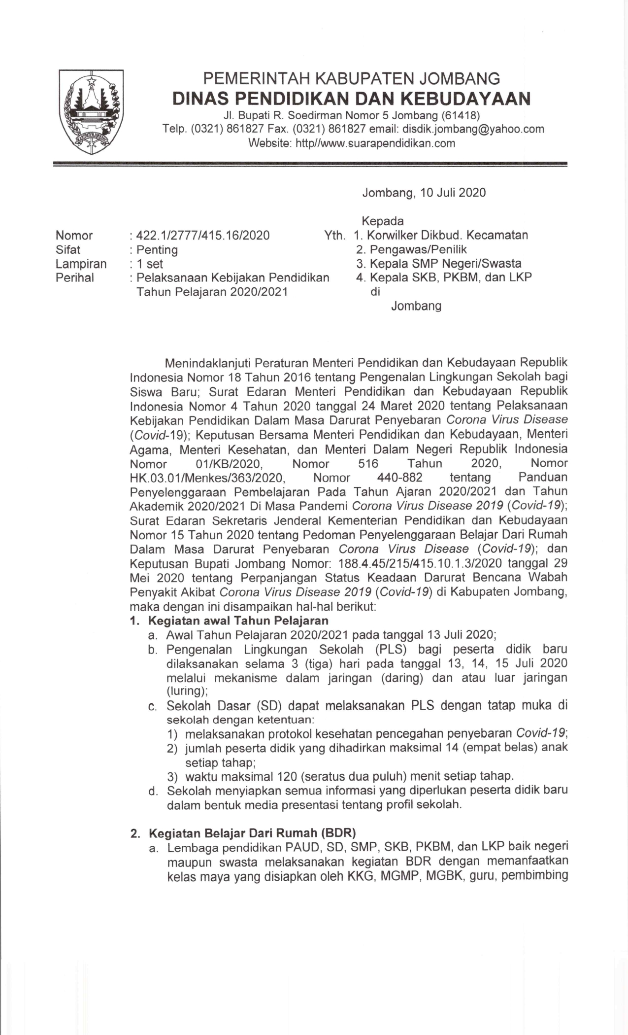 JOMBANGKAB.GO.ID, DISDIKBUD - Dinas Pendidikan dan Kebudayaan (Disdikbud) Kabupaten Jombang luncurkan surat edaran terkait dengan Pelaksanaan Kebijakan Pendidikan Tahun Pelajaran 2020/2021, Nomor 422.1/2777/415.16/2020 tanggal 10 Juli 2020, yang ditujukan kepada Korwilker Dikbud. Kecamatan, Pengawas/Penilik, Kepala SMP Negeri/Swasta serta Kepala SKB, PKBM dan LKP di Kabupaten Jombang.