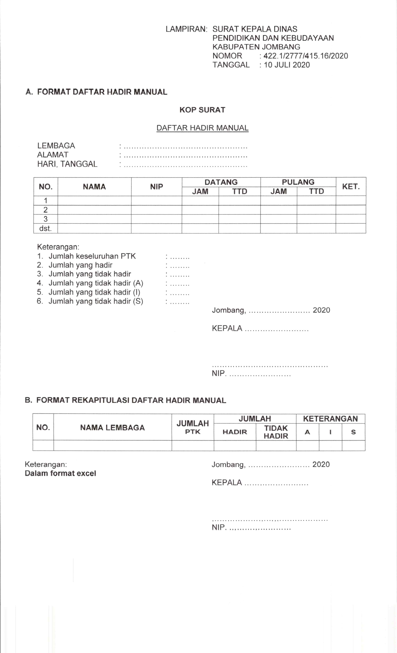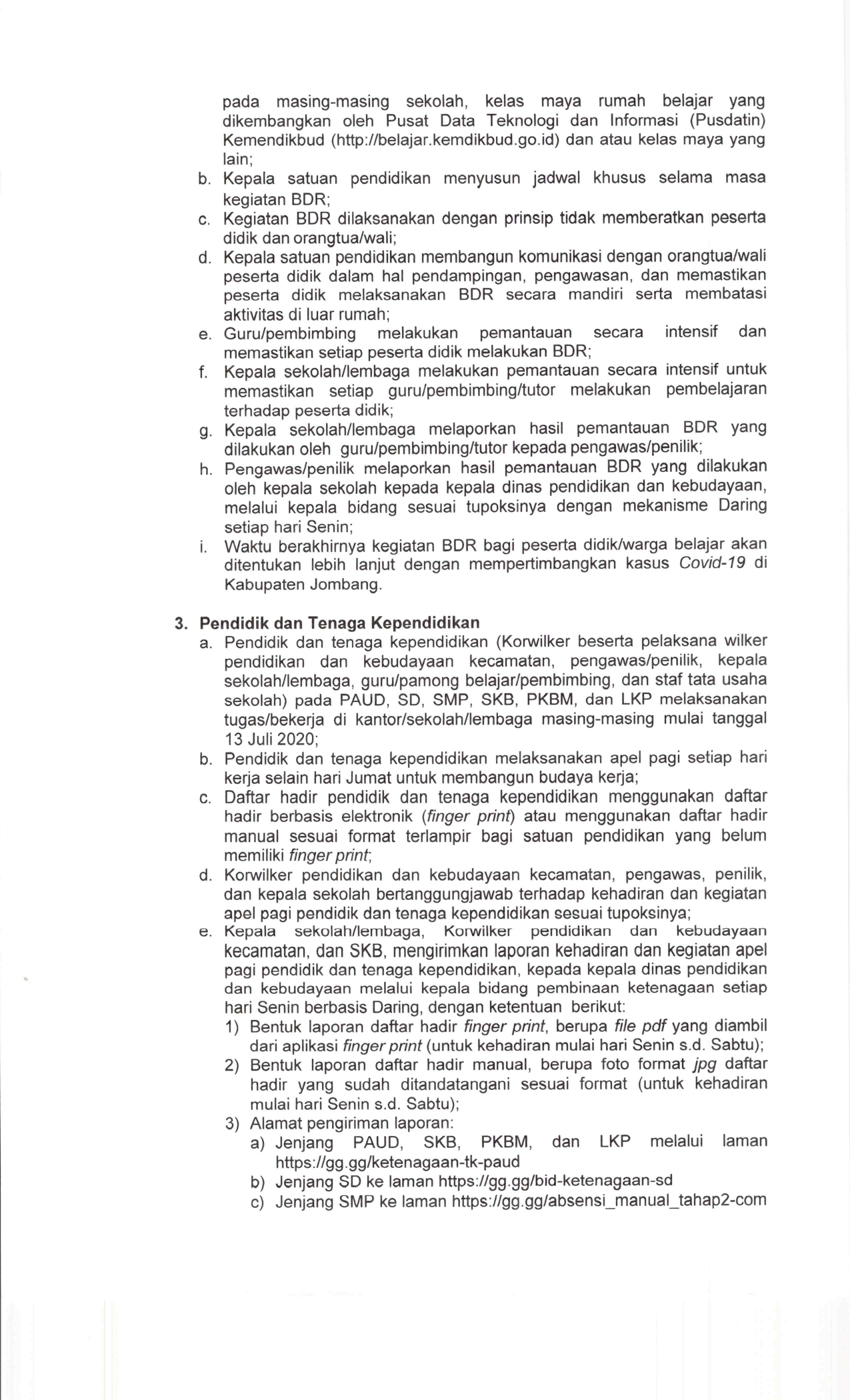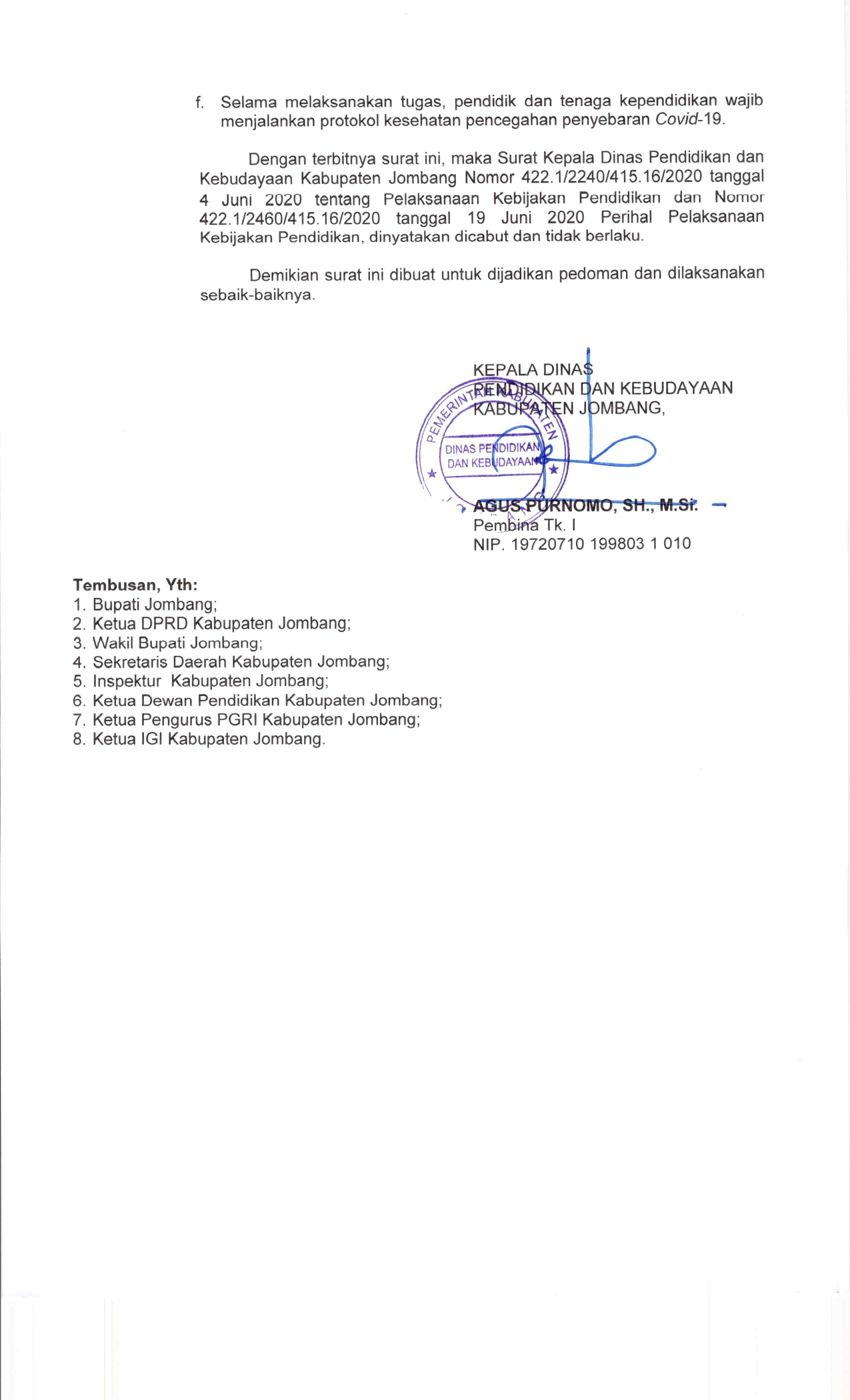 Dengan terbitnya surat ini, maka Surat Kepala Disdikbud Jombang Nomor : 22.1/2240/415.16/2020 tanggal 4 Juni 2020 dan Nomor: 422.1/2260/415.16/2020 tanggal 19 Juni 2020 tentang Pelaksanaan Kebijakan Pendidikan dinyatakan dicabut dan tidak berlaku.