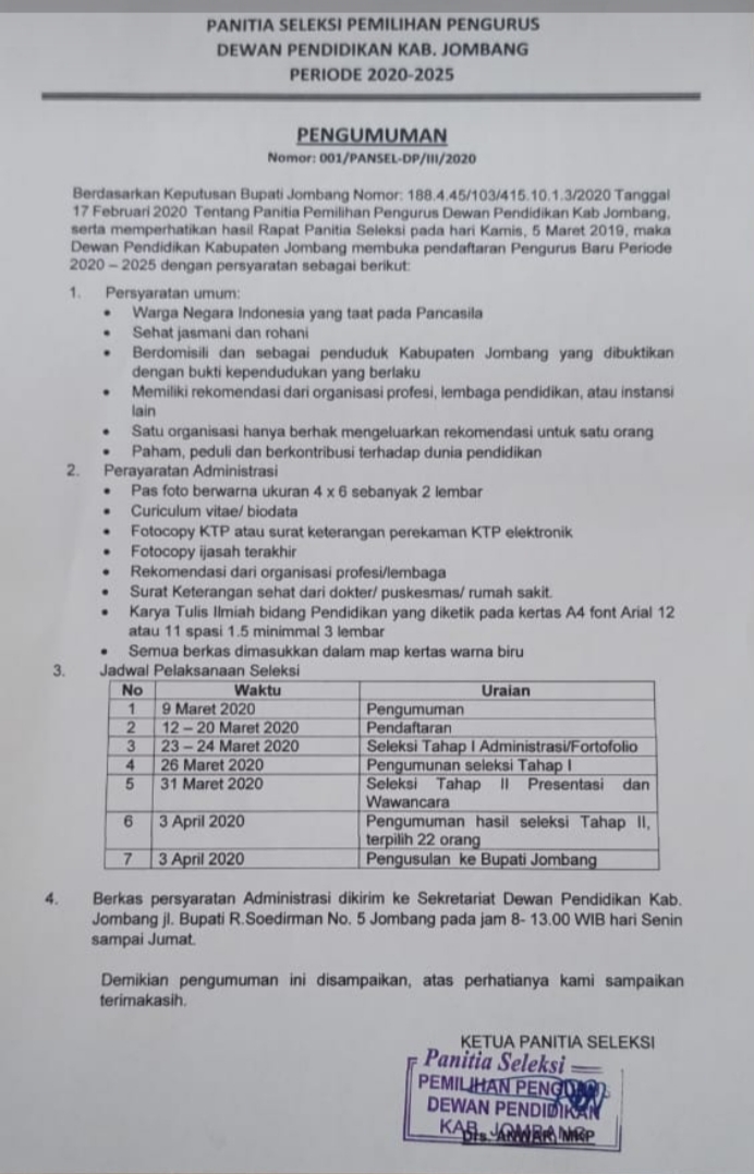 JOMBANGKAB.GO.ID, DISDIKBUD - Berdasarkan Keputusan Bupati Jombang Nomor: 188.4.45/103/415.10.1/2020 tanggal 17 Februari 2020 tentang panitia Pemilihan Pengurus Dewan Pendidikan Kab. Jombang serta memperhatikan hasil rapat panitia seleksi pada hari kamis, 5 maret 2019. Maka Dewan Pendidikan Kabupaten Jombang membuka pendaftaran Pengurus Baru Periode 2020 – 2025 dengan persyaratan sebagai berikut :