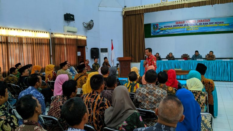 JOMBANGKAB.GO.ID, DISDIKBUD - Serah terima jabatan kepala sekolah jenjang TK, SD dan SMP Negeri lingkup Dinas Pendidikan dan Kebudayaan (Disdikbud) Kabupaten Jombang tahun 2020 digelar di aula 1 pada Jumat (7/2) pagi. Acara tersebut diselanggarakan oleh Disdikbud Jombang melalui Bidang Pembinaan Ketenagaan yang dihadiri oleh 79 kepala sekolah. Jumlah itu terdiri dari 76 kepsek baru yang sudah dilantik oleh Bupati Jombang Mudjidah Wahab di Ruang Bung Tomo Pemkab Jombang pada Rabu (5/2) lalu, dan 3 kepsek lama.