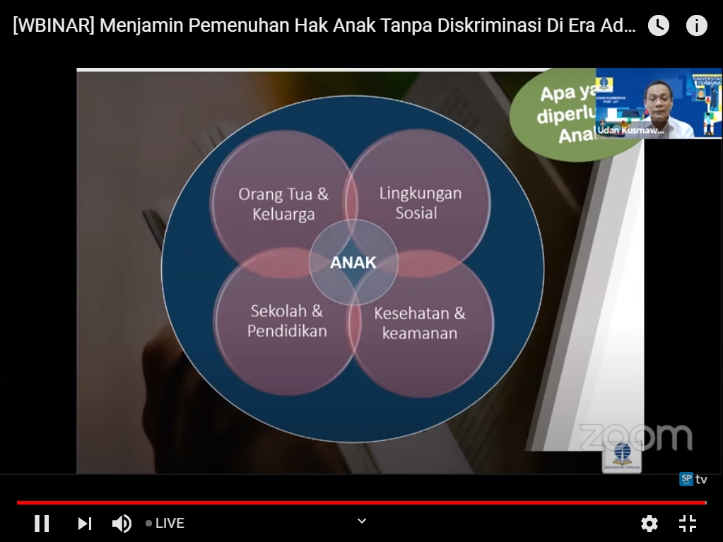 Pemateri pertama webinar ini yaitu Profesor Udan Kusmawan memaparkan tentang apa saja yang diperlukan anak mulai dari orangtua dan keluarga, lingkungan sosial, kesehatan dan keamanan, sekolah dan pendidikan.