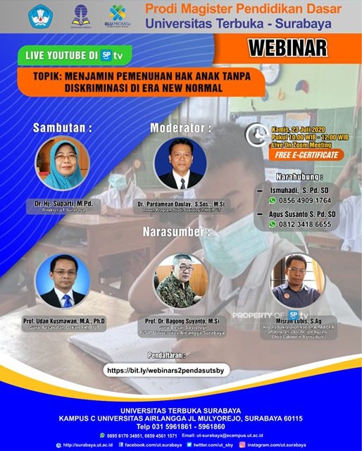Menyikapi hal tersebut Universitas Terbuka (UT) Surabaya menggelar Webinar dengan tema “Menjamin Pemenuhan Hak Anak Tanpa Diskriminasi” pada hari Kamis (23/7) yang disiarkan langsung dari Studio Suara Pendidikan - Dinas Pendidikan dan Kebudayaan (Disdikbud) Kabupaten Jombang.