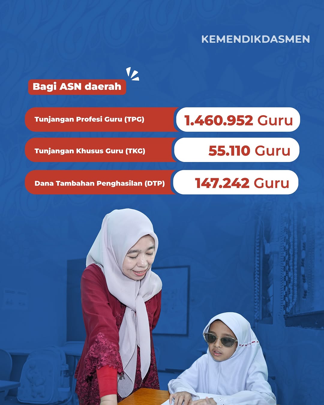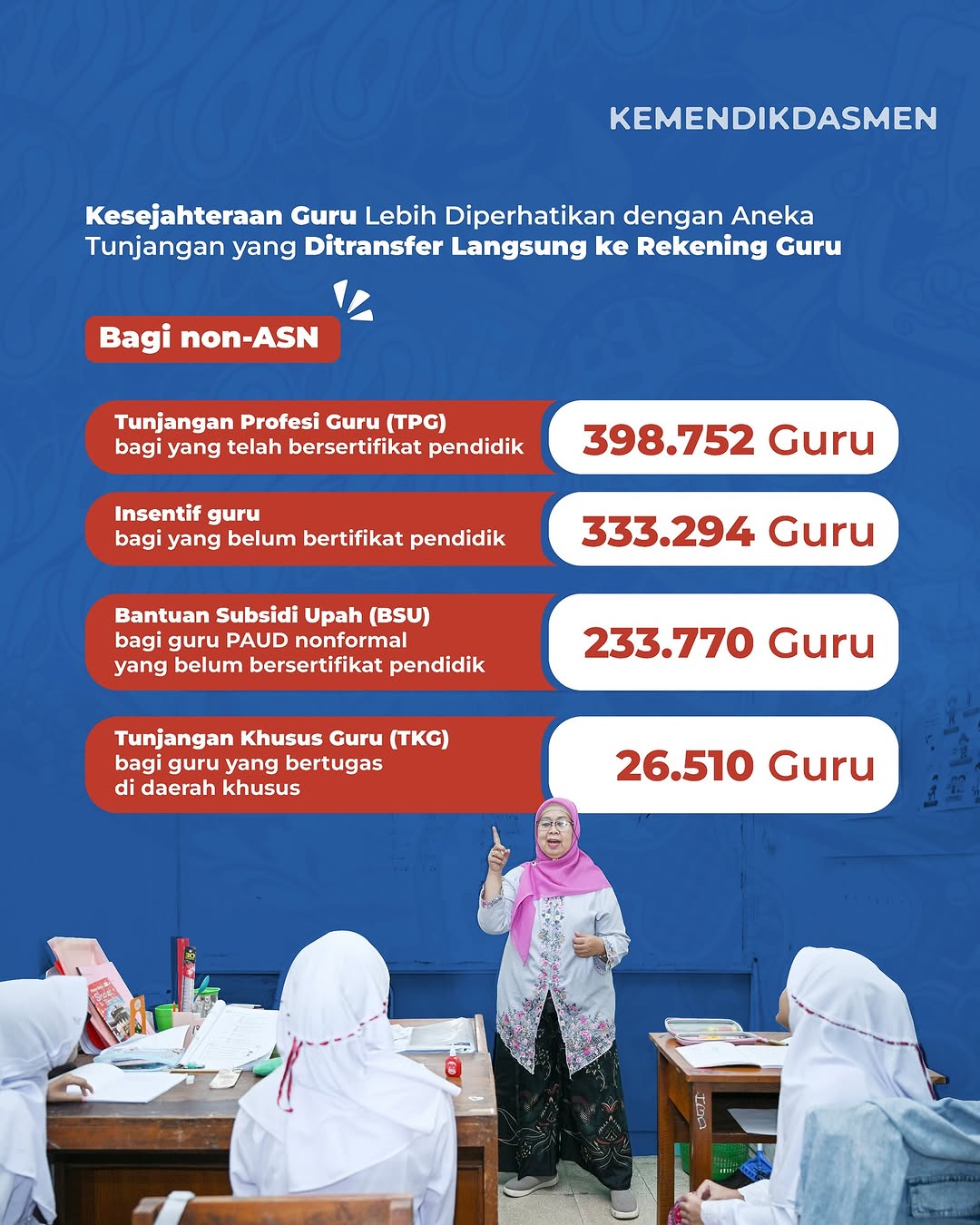 Tidak hanya itu, kesejahteraan guru turut menjadi prioritas pemerintah yang ditunjukkan dengan pemberian aneka tunjangan bagi guru yang ditransfer langsung ke rekening masing-masing, serta pemberian beragam pelatihan dan afirmasi pendidikan untuk membekali mereka menjawab tantangan zaman yang makin maju.