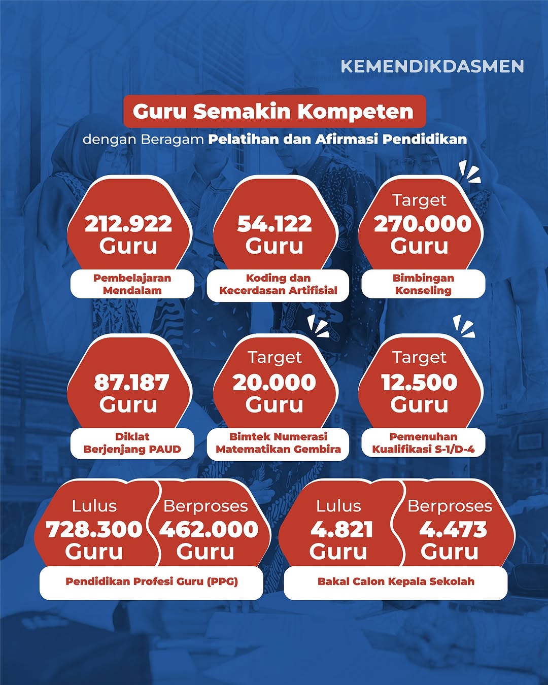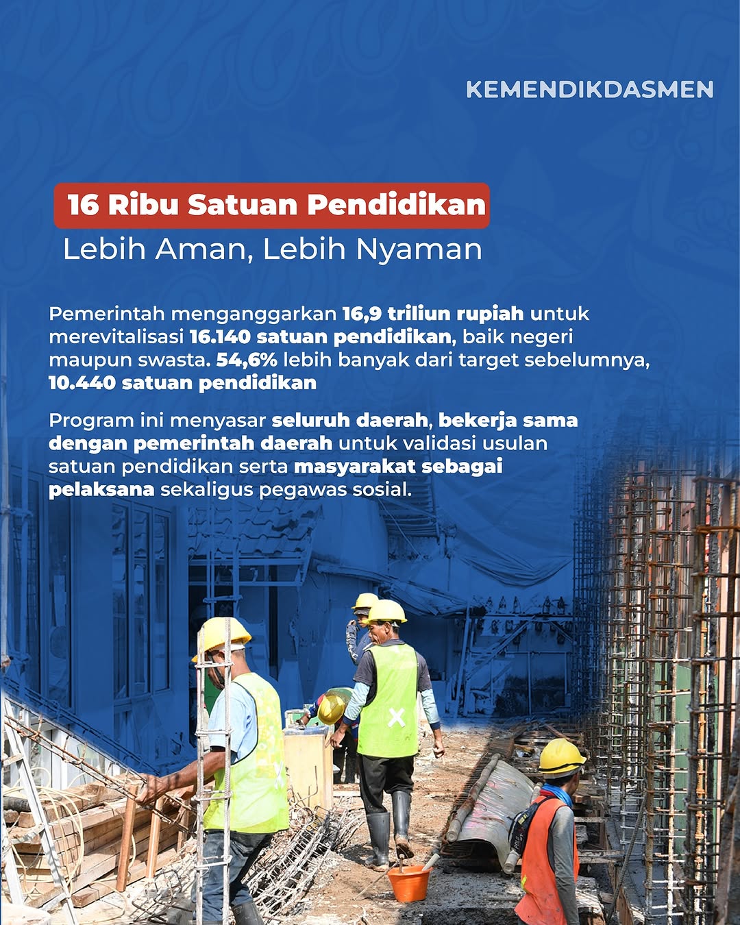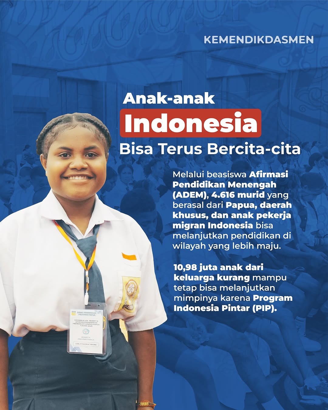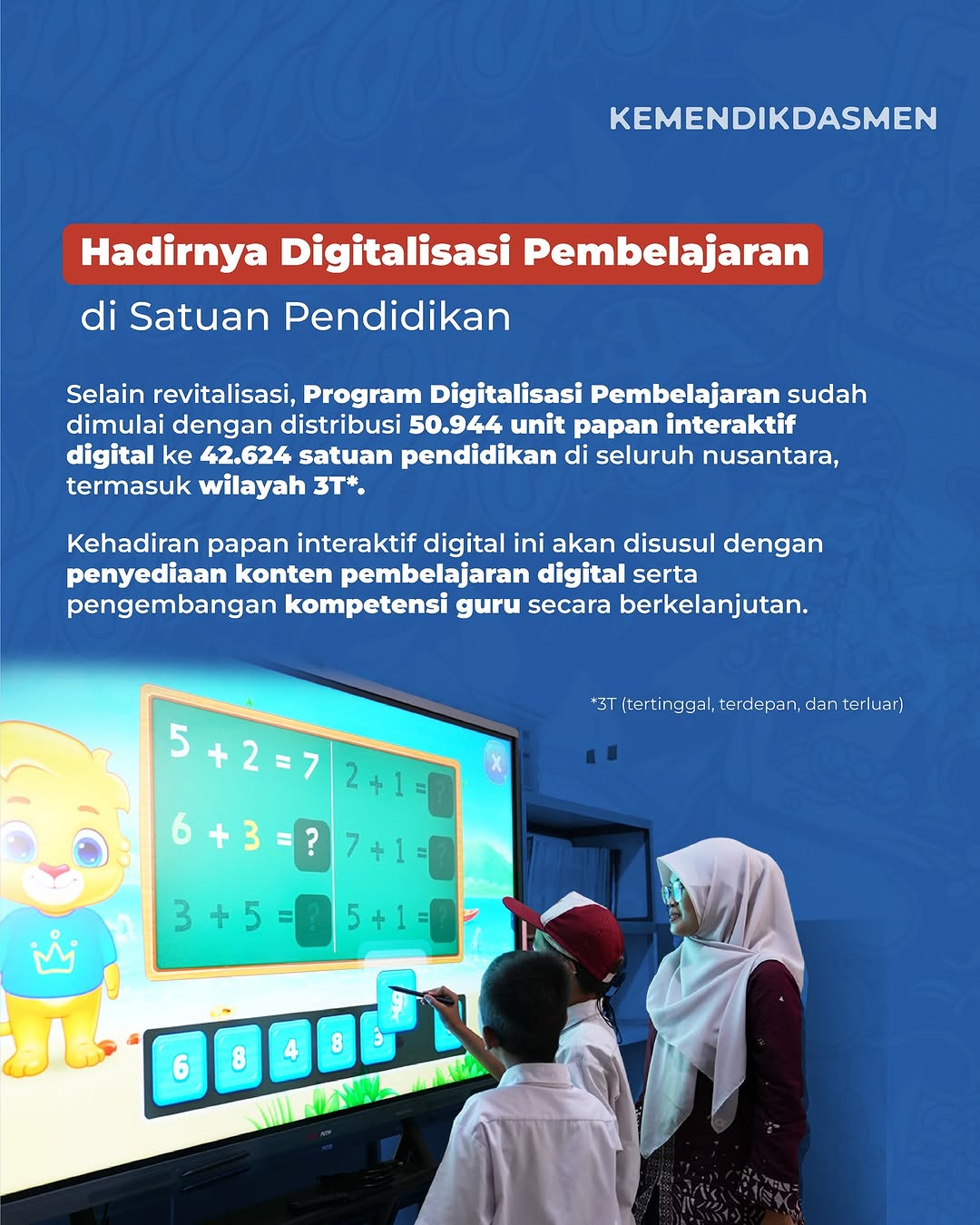 Untuk mewujudkannya, berbagai program strategis dijalankan secara terintegrasi mulai dari program revitalisasi yang menargetkan 16.140 satuan pendidikan, digitalisasi pembelajaran melalui penyaluran 50.944 papan interaktif digital ke 42.624 satuan pendidikan, serta program Beasiswa Afirmasi Pendidikan Menengah (ADEM) yang membantu 4.616 murid dari Papua, daerah khusus, dan anak pekerja migran Indonesia agar tetap dapat melanjutkan pendidikan.