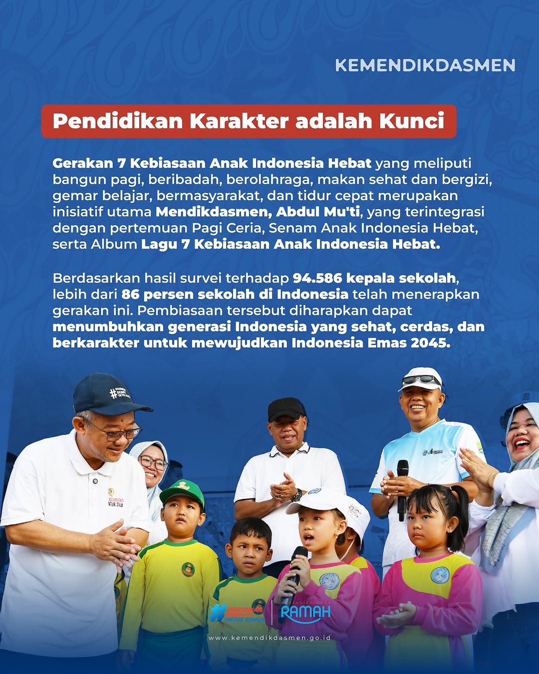 Gerakan Tujuh Kebiasaan Anak Indonesia Hebat yang dicanangkan Kemendikdasmen telah diterapkan m lebih dari 86% sekolah di Indonesia dan diharapkan dapat menumbuhkan generasi Indonesia yang sehat, cerdas, dan berkarakter positif di masa depan. (sumber: @kemendikdasmen)