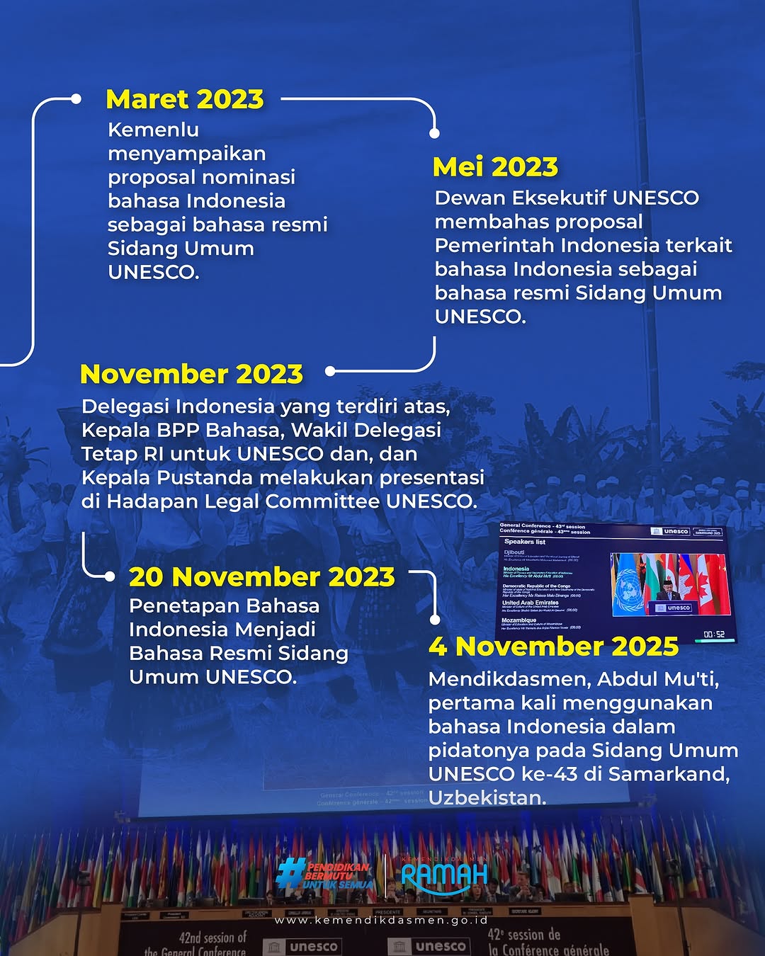 Momen bersejarah kembali terukir saat Mendikdasmen Abdul Mu'ti menyampaikan Pernyataan Nasional pada Sidang Umum UNESCO ke-43 di Kota Samarkand, Uzbekistan dengan menggunakan bahasa Indonesia untuk pertama kalinya setelah bahasa Indonesia resmi dijadikan sebagai bahasa kerja ke-10 pada Sidang Umum UNESCO.