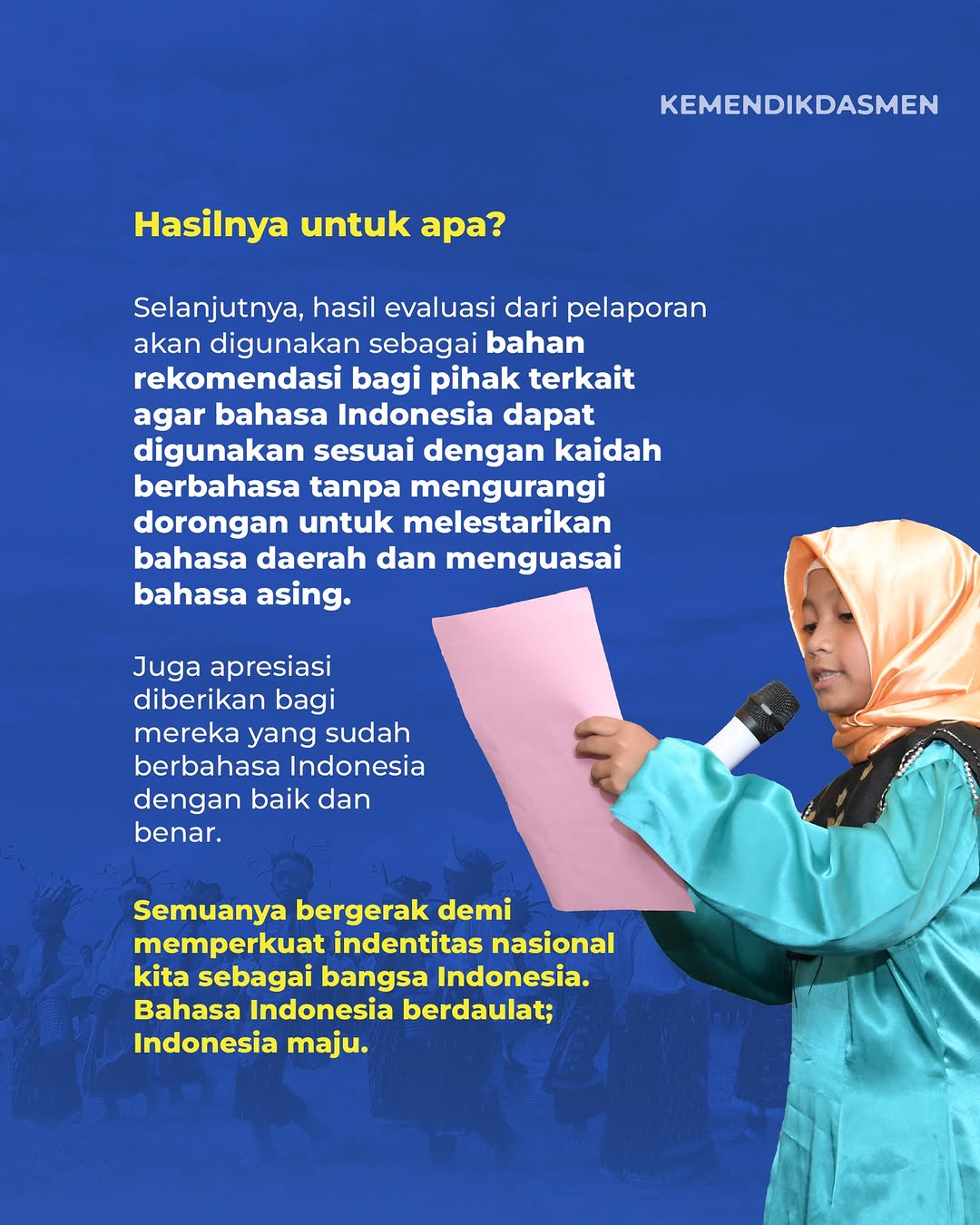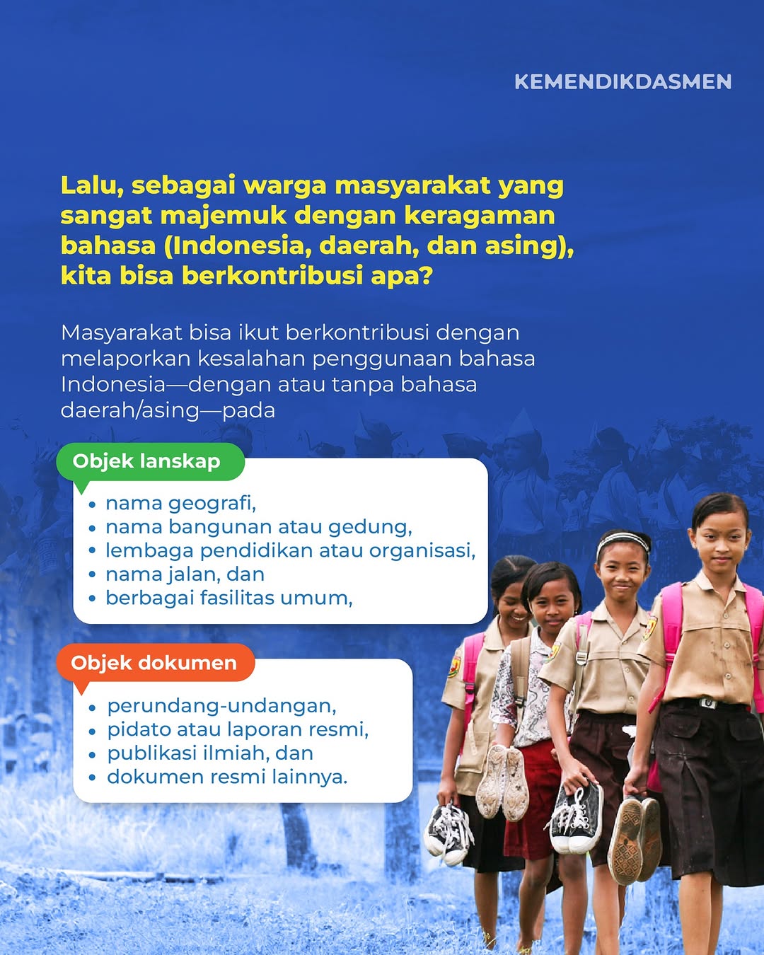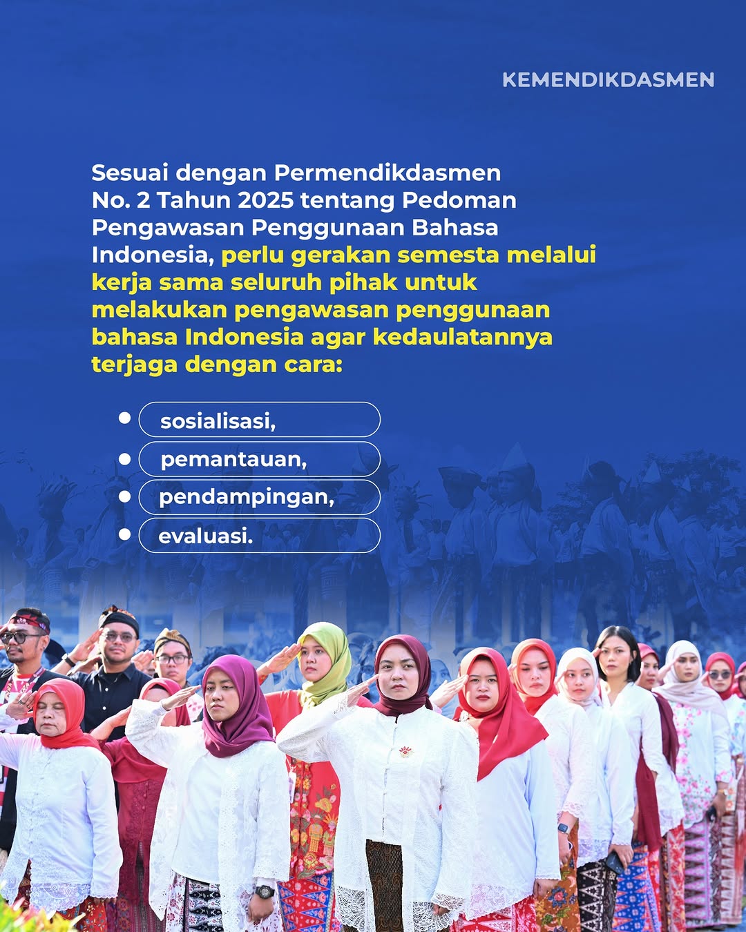 Hal ini bertujuan agar penggunaan bahasa Indonesia, seperti di ruang publik maupun di dokumen resmi bisa sesuai dengan kaidah yang berlaku. Untuk itu, mari bersama kita jaga kedaulatan bahasa Indonesia dengan ikut mengawasi penggunaan bahasa Indonesia. (sumber: @kemendikdasmen)
