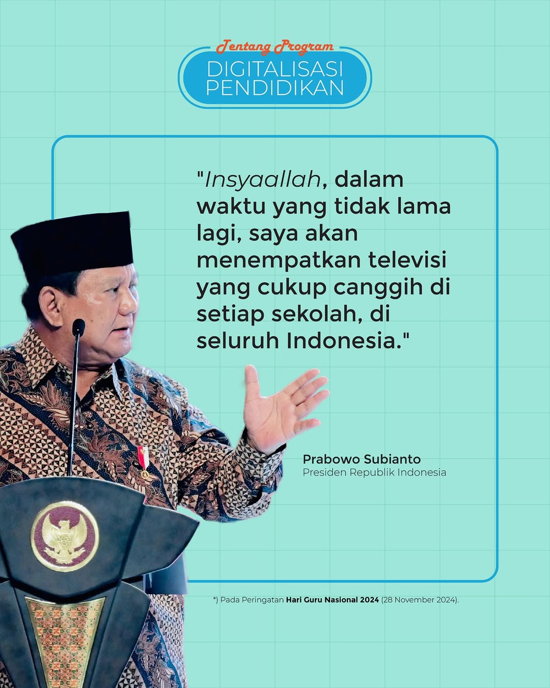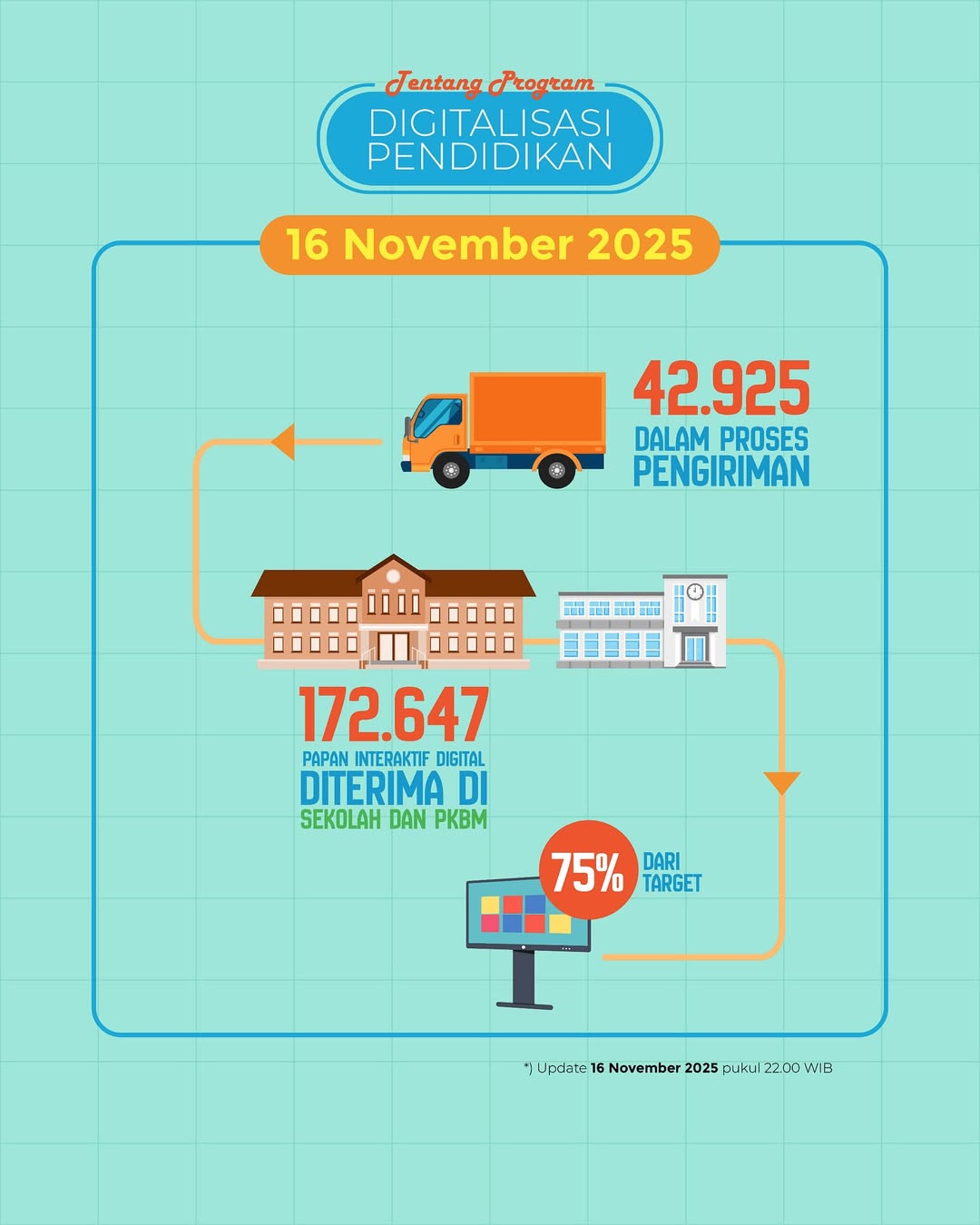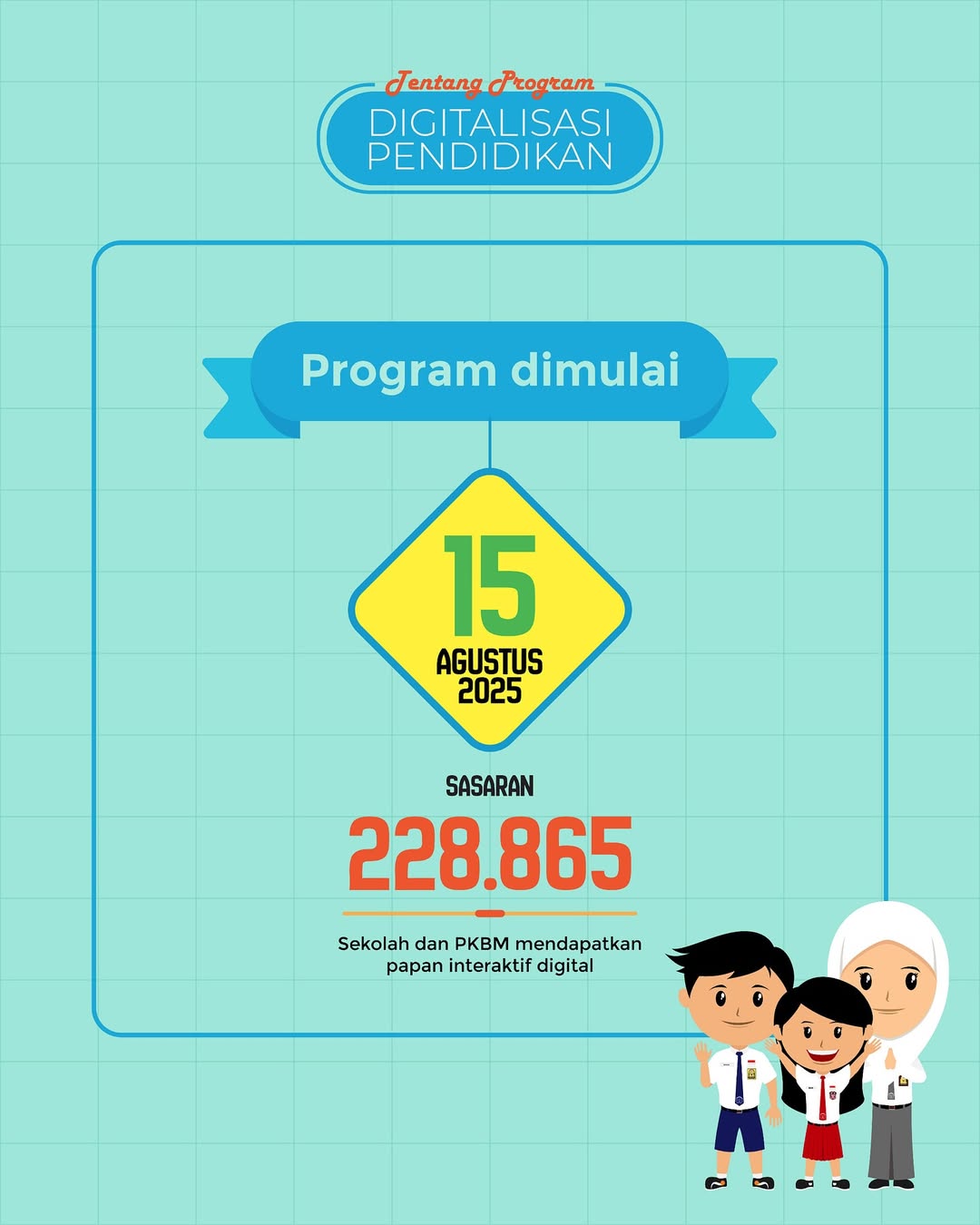Program digitalisasi pembelajaran mulai dilaksanakan pada 15 Agustus 2025 untuk 288.865 sekolah yang distribusinya telah mencapai 75% dari target dan akan terus didistribusikan sampai Desember 2025. (sumber: @kemendikdasmen)