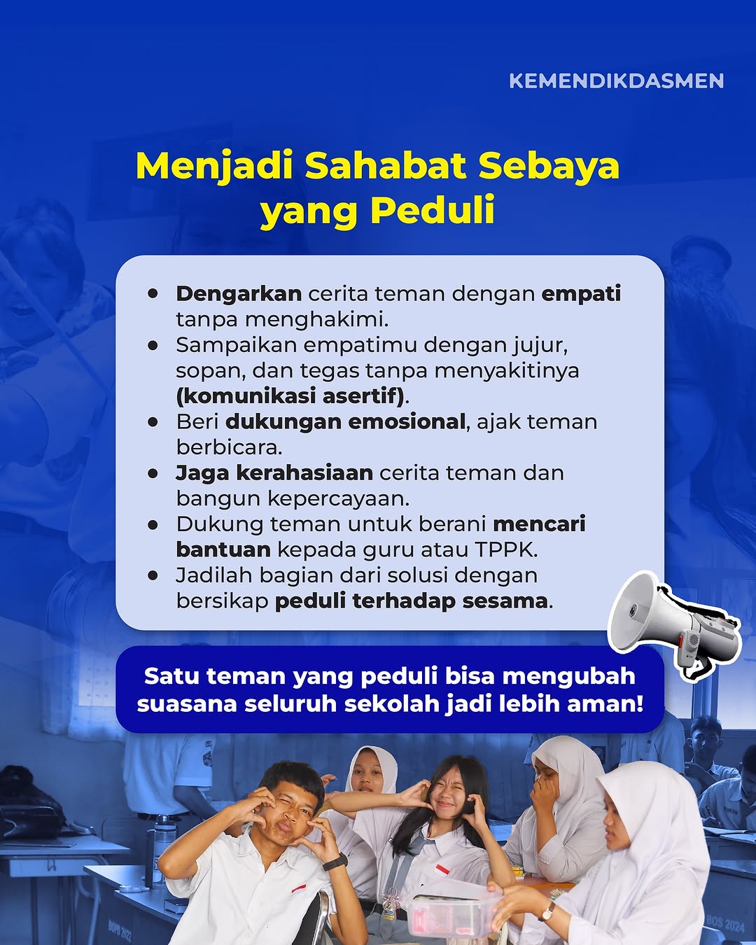 Namun, ketika kekerasan terjadi, diam bukanlah pilihan. Setiap murid, guru, dan warga sekolah berhak untuk didengar dan dilindungi. Melapor tidak membutuhkan bukti, tetapi cukup ceritakan yang dialami. Tiap murid juga bisa menjadi Sahabat Sebaya, teman yang peduli dan penuh empati.
