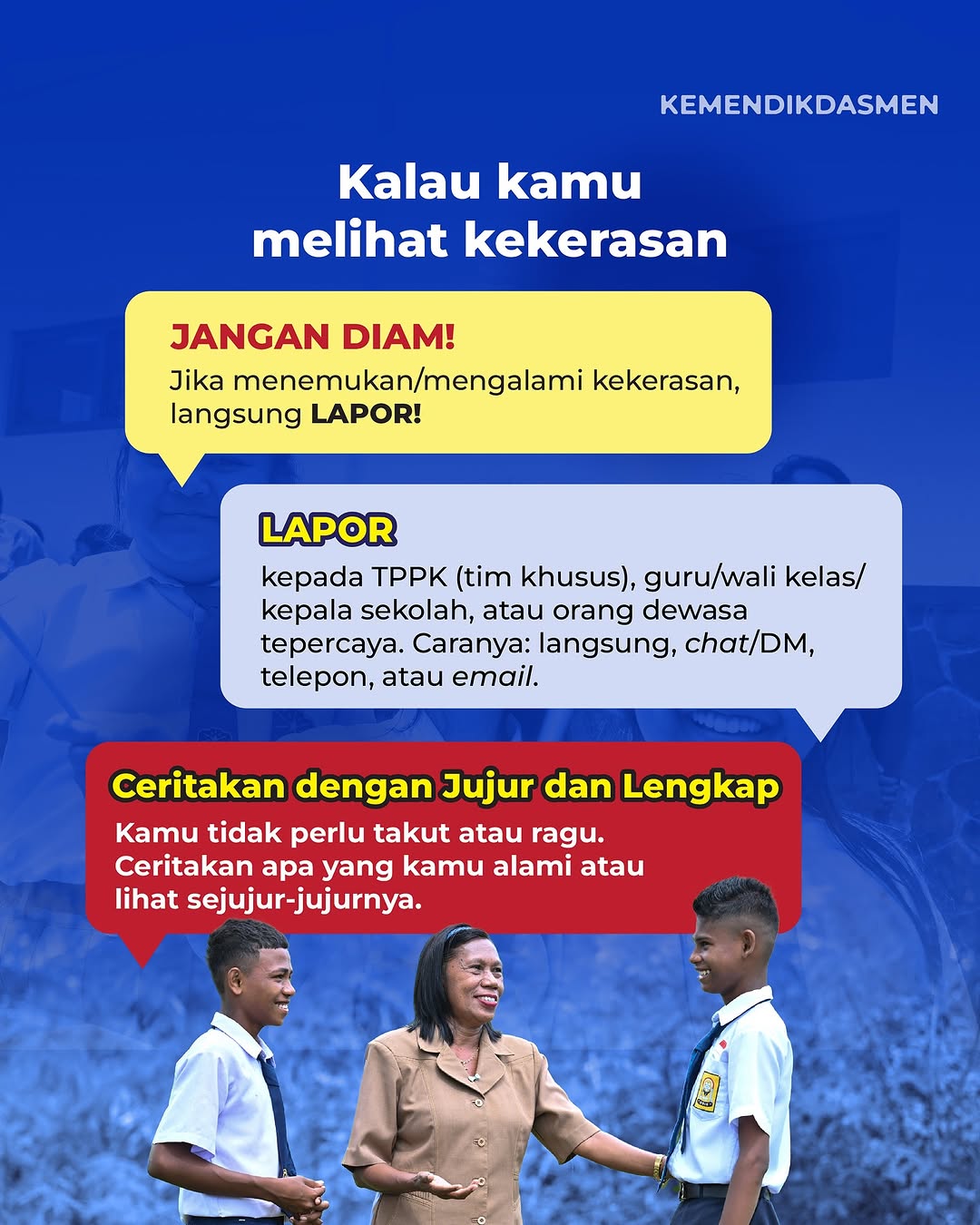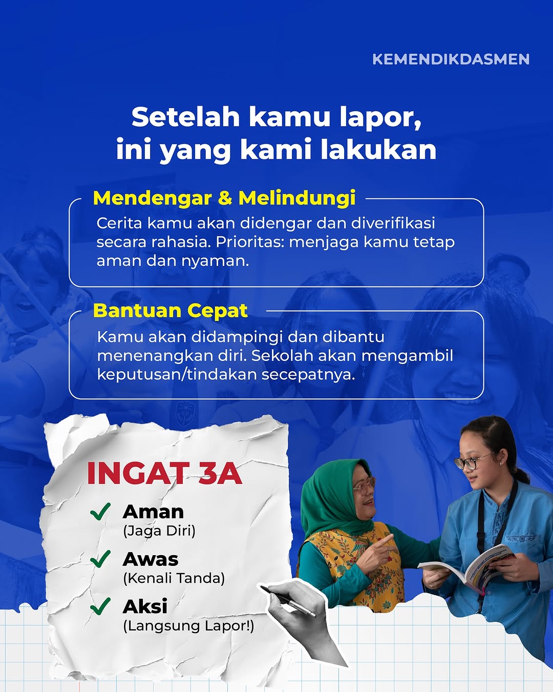 Sekolah memiliki mekanisme yang siap menindaklanjuti laporan dengan cepat dan menjaga kerahasiaan pelapor. (sumber: @kemendikdasmen)